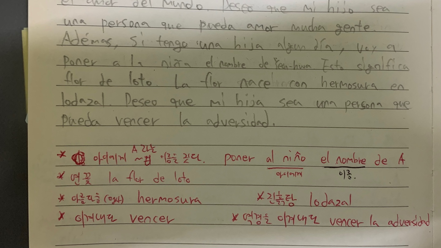 En cambio, si tengo un hija algun día, pondré a mi niña del nombre 'Yeon-hwa' . Esto significa el flor de loto como dice la palabra. Esta flor nace con hermosura en lodazal. Deseo que mi hija sea una persona que pueda vencer la adversidad.