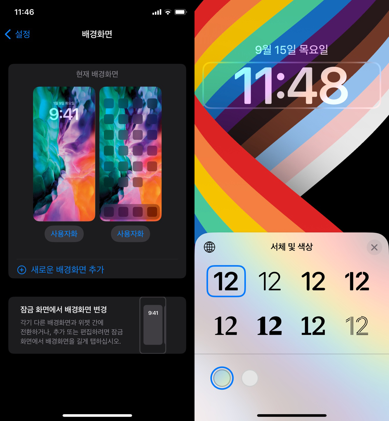 그래서 저는 시계 숫자 굵기를 좀 조절해보고자 [설정]-[배경 화면]-왼쪽 잠금화면 하단에 있는 [사용자화]로 들어갔습니다.