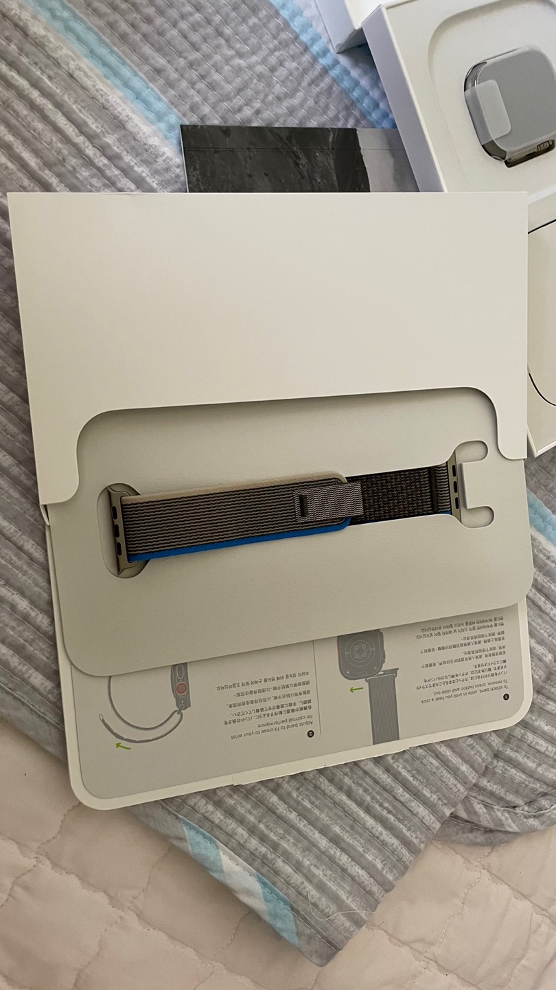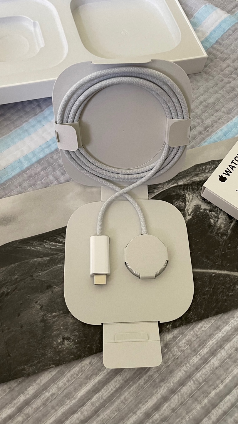 참고로 내부 구성품은 시계 본체와 블루 그레이 색상의 트레일 루프 스트랩, 충전기선, 제품 설명서가 들어있었는데 제가 제품 박스를 열면서 잠깐 당황스러웠던 점은 제품 박스 안에 애플워치 충전용 선만 들어있고 충전기 어댑터는 들어있지 않았다는 점입니다. 물론 아이패드 프로 4세대 이후 제품을 갖고 계신 분들이나 아이폰 충전기로 이미 c 타입 20w 어댑터를 갖고 계신 분들은 상관없겠지만, 그렇지 않으신 분들도 계실 테니 이 점 꼭 유의하셔서 충전 어댑터를 미리 구매하시길 바랍니다. (저는 아이패드 프로 4세대를 쓰고 있어 어댑터를 따로 사도 되지 않았으나 평소에 충전을 한꺼번에 하는 스타일이기에 어댑터를 하나 더 구매하게 되었습니다.)