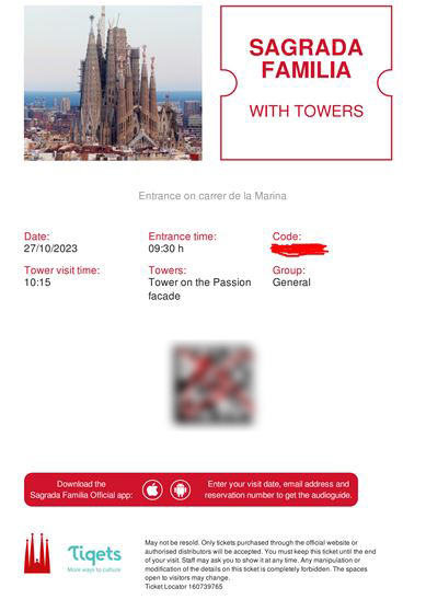 아! 그리고 예매한 티켓의 경우 스마트폰으로 티켓을 보여주고 입장이 가능한지 여부를 반드시 확인해 주세요! 어떤 티켓은 스마트폰으로 보여준 후 입장이 가능한데, 또 다른 티켓은 스마트폰으로 보여준 것은 인정이 안 되고 직접 인쇄해서 가져온 것만 가능하다고 쓰여 있기도 하거든요. 저의 경우 관광지 한 곳 빼고는 스마트폰으로 예매한 티켓을 보여주면 입장이 가능했는데 혹시나 현지 인터넷이 잘 터지지 않을까 싶어서 그냥 마음 편하게 예매한 티켓을 모두 인쇄해서 가져갔습니다. (사그라다 파밀리아 성당에 입장을 할 때 외국인분들도 저와 같은 마음인 건지 대부분 인쇄해서 가져오시긴 하더라고요.)