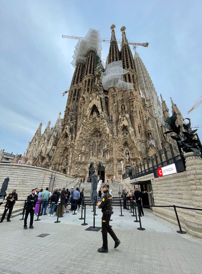 그리고 사그라다 파밀리아 성당 입장하실 때 입구에 쳐져 있는 바리케이드를 지나시면 바로 보안검색대가 나오는데요. 다른 관광지들과는 다르게 사그라다 파밀리아 성당은 성스러운 곳이기도 하고, 아직 공사가 진행 중이기 때문에 테러를 방지하고자 공항처럼 소지품 검사를 합니다. 금속탐지기에 소지품 x-ray 검사대까지 모두 있지요. 직원들은 직접 기계로 소지품 검사를 하고, 소지품 검사가 모두 완료되면 성당으로 올라가는 입구에서 직원이 표를 확인하고 안으로 입장을 시켜줍니다. (성당 밖에서는 가드가 눈으로 표를 검사한다면, 안에서는 직원이 QR코드로 표를 검사합니다.)