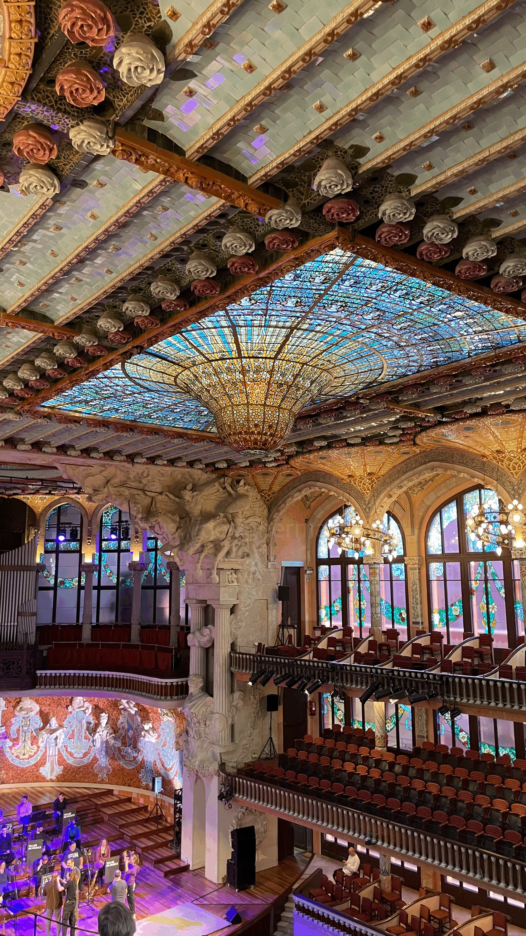까탈루냐 음악당을 방문하게 되시면 꼭 보셔야 할 것들이 있는데요. 위에 사진에도 나와 있지만 하나는 음악당 외부 모서리에 있는 조각상이고, 다른 하나는 음악당 내부의 스테인드글라스입니다. 외부 조각상의 경우 '까탈루냐의 노래'라 불리는 조각상인데요. 여인은 음악을 상징하고 여인 위에 있는 사람은 카사 바트요 건축에도 모티브로 쓰인 까탈루냐의 성인, 산 조르디입니다. 그리고 음악홀 내부 천장에는 정교하고 화려한 스테인드글라스가 있는데 여기에는 스페인 최초 여성 합창단인 오르페오(Orfeo)의 여성 단원 얼굴들이 새겨져 있습니다. (이 스테인드글라스는 삼성인가 LG 디스플레이 광고에도 나왔습니다.)