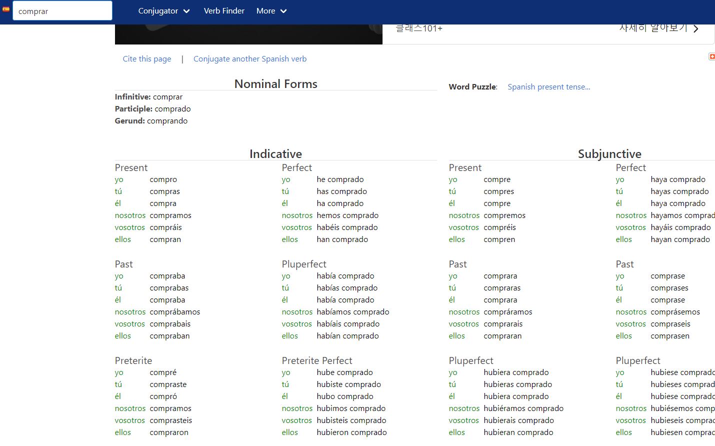 스페인어 공부하시다가 새롭게 배운 동사의 변화형태를 알고 싶을때 동사를 입력하시면 동사의 현재형부터 과거형변화와 미래형 변화, 그리고 접속법 변화까지 모두 확인하실 수 있습니다. 만약 기초 공부를 하실때마다 동사변화 부분이 막히시면 사이트를 꼭 이용하세요! 스페인어 기초 공부에 아주 도움이 됩니다. 저 역시 학원에서 스페인어 공부를 할때마다 동사 변화가 막힐때면 이 사이트를 이용하였습니다.