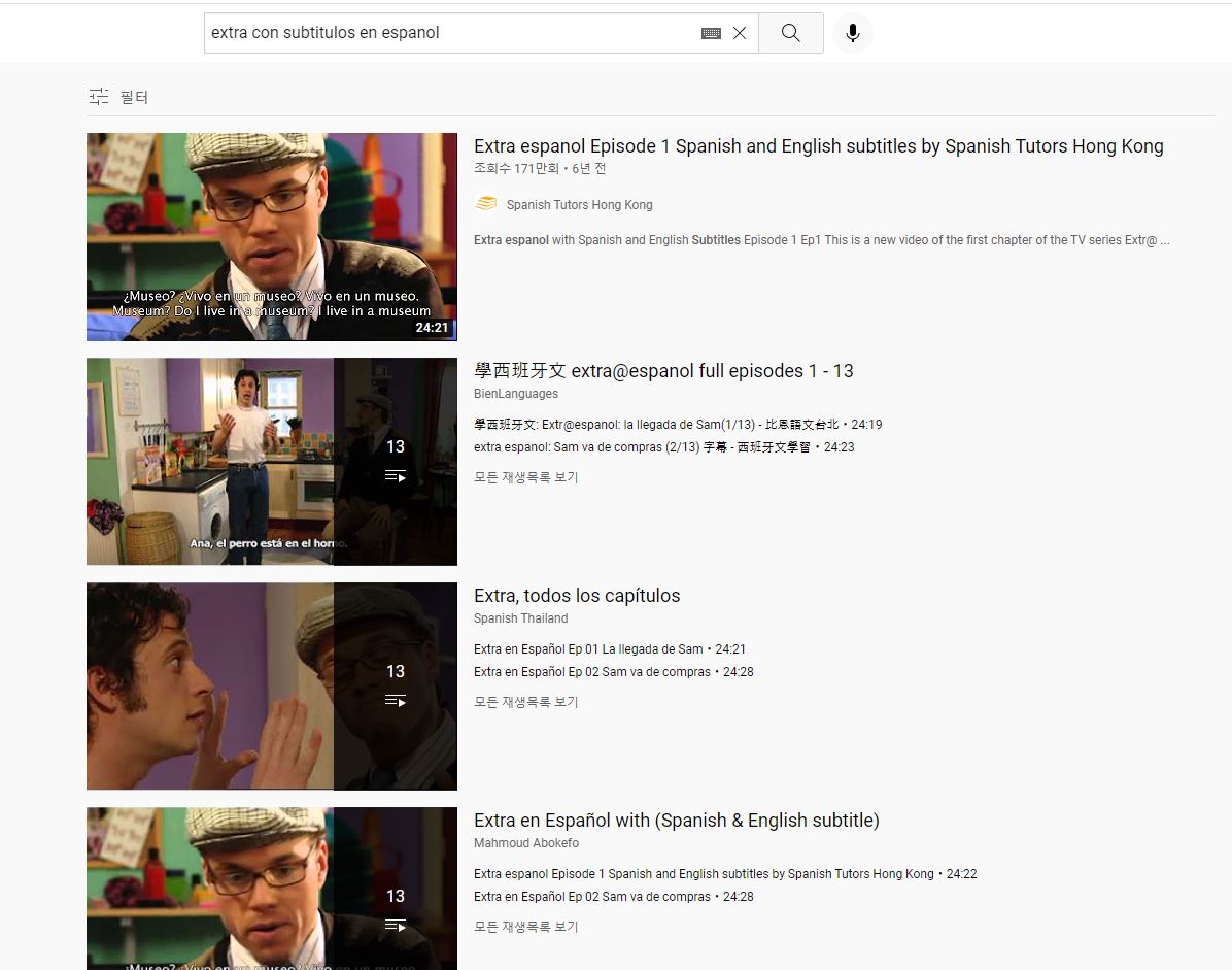 넷플릭스를 구독하고 계신 분들이라면 스페인어가 나오는 시리즈를 보시면 되지만 구독을 안 하시는 분들도 있으시기 제가 스페인어 드라마를 하나 추천하겠습니다. 바로 Extra라고 하는 드라마인데요. 유튜브에서 'extra con subtitulos en Espanol' 라고 검색을 하시면 바로 보실 수 있습니다. (자막 없이 보시려면 자막을 끄실 수도 있습니다)